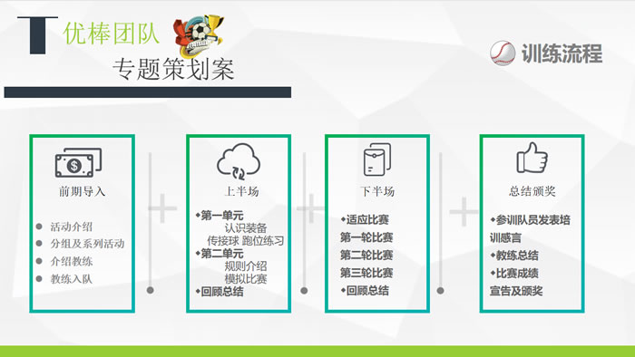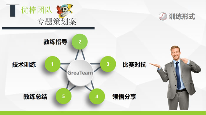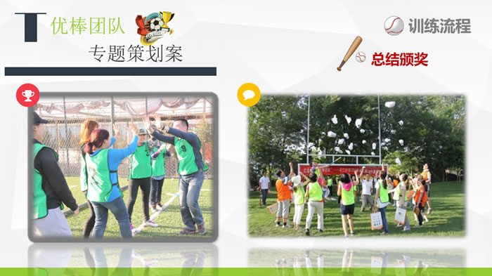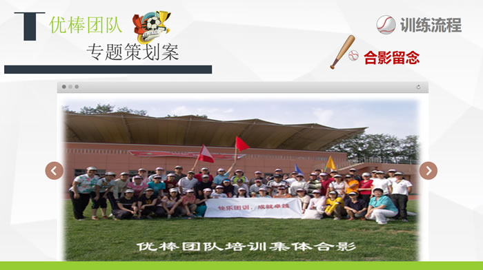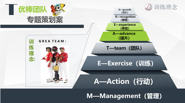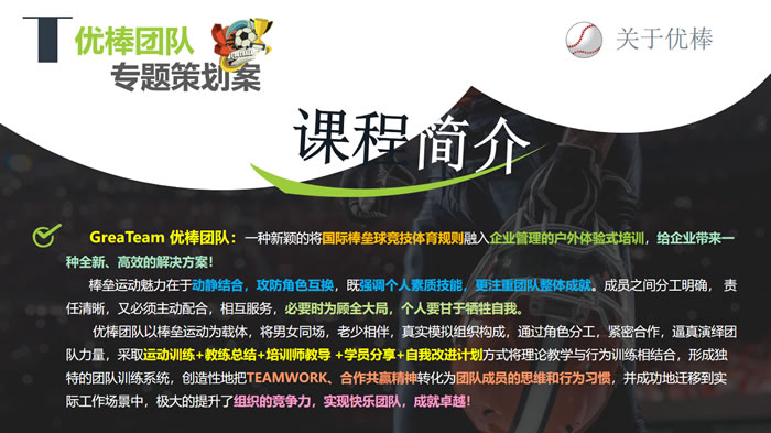 GreaTeam 優棒團隊:一種新穎的將國際棒壘球競技體育規則融入企業管理的戶外體驗式培訓,給企業帶來一種全新、高效的解決方案!優棒團隊以棒壘運動為載體,將男女同場,老少相伴,真實模擬組織構成,通過角色分工,緊密合作,逼真演繹團隊力量,采取運動訓練+教練總結+培訓師教導 +學員分享+自我改進計劃方式將理論教學與行為訓練相結合,形成獨特的團隊訓練系統,創造性地把TEAMWORK、合作共贏精神轉化為團隊成員的思維和行為習慣,并成功地遷移到實際工作場景中,極大的提升了組織的競爭力,實現快樂團隊,成就卓越!