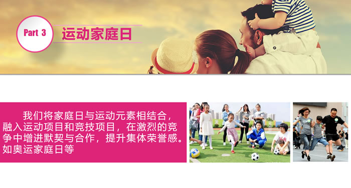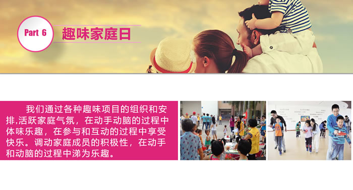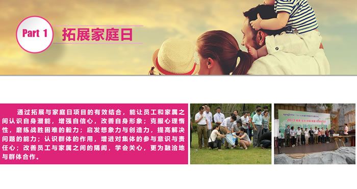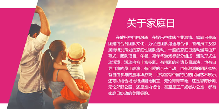 依家庭日是企業(yè)員工攜家屬共同參與的歡樂盛會,在輕松愉快的環(huán)境中,使員工和家屬充分體驗企業(yè)文化,增進員工之間的交流互動,和對企業(yè)的歸屬感和凝聚力。 豐富精彩的家庭日活動,將企業(yè)文化與家庭文化融合,激發(fā)員工及其家屬的自豪感,幫助員工贏得親人的鼓勵與支持,為企業(yè)創(chuàng)造更健康快樂的工作氛圍。
