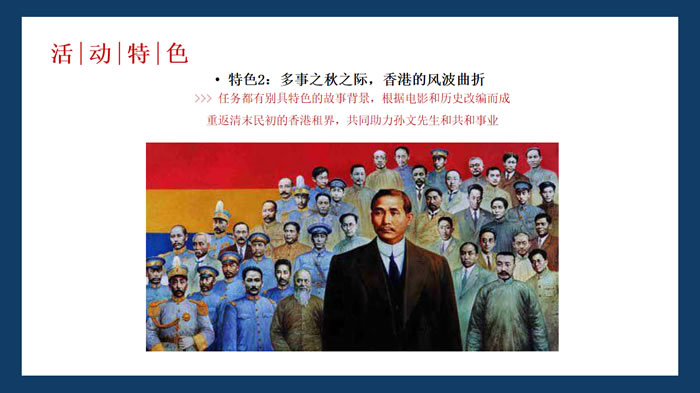 大家將被分成5人一組,跟著App提供的線索闖關,和陳少白一起,保護好孫先生的安全!在規定時間內,需要整組隊員頭腦風暴仔細搜尋,緊密團結協同合作,集體穿越活動指定的任務點,才能闖過重重關卡,獲得積分成績,參賽隊須全體到達終點簽到,按積分高低評定最終成績。